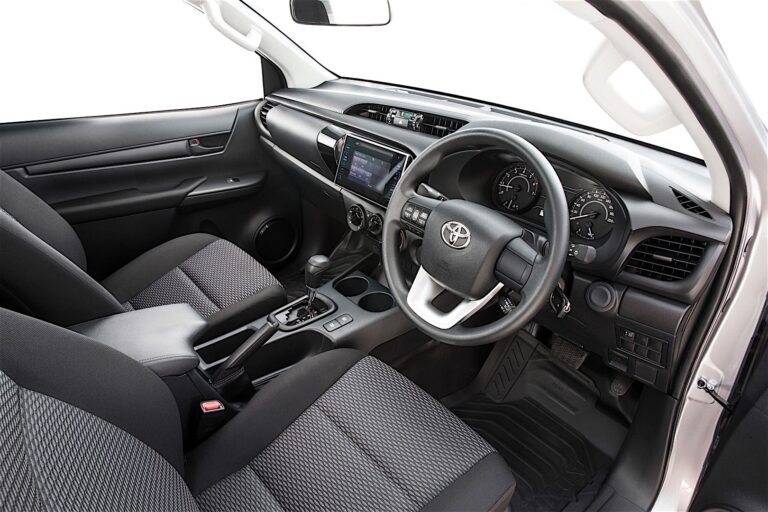 Wygląd i dotyk wnętrza nowego Hilux są podkreślone metalicznie pokrytymi ozdobami na desce rozdzielczej, wykończeniu drzwi, tablicy przyrządów kierowcy, kierownicy i osłonie dźwigni zmiany biegów. Dodatkowo harmonizujący wizualnie niebieski podświetlenie i podświetlenie wskaźników są zastosowane w całym wnętrzu.