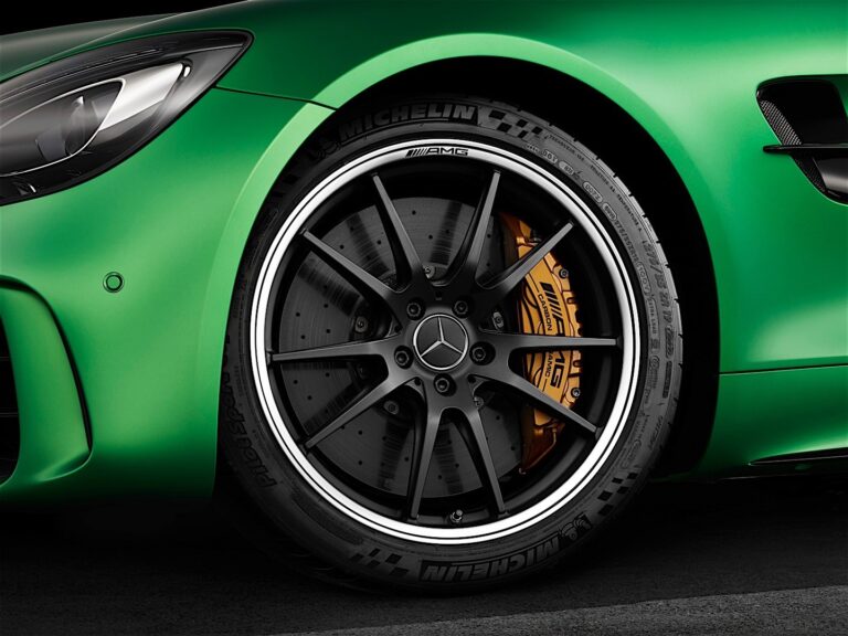 Widok z boku dodatkowo korzysta z nowych, opcjonalnych felg AMG Performance z odlewanego aluminium w matowej czerni. Szczególnie lekkie 10-ramienne koło jest ekskluzywne dla AMG GT R, a jego bardzo skomplikowany design obejmuje obręcz z opadającym środkiem, frezowaną szczelinę oraz dwa błyszczące pierścienie obręczy o różnej szerokości. Z przodu znajdują się koła o wymiarach 10.0 J x 19 ET56, a z tyłu 12.0 J x 20 ET52. Lekka konstrukcja felg ma trzy zalety: redukuje całkowitą wagę, masy rotacyjne oraz masy niepodporowe. Efektywność i wydajność są zwiększone, podczas gdy zawieszenie kół i układ kierowniczy dostarczają jeszcze dokładniejszej reakcji, co również ma pozytywny wpływ na układ jezdny i systemy kontroli zawieszenia.