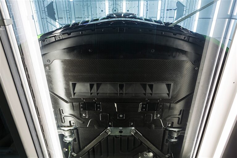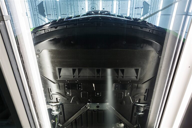 Specjalnym osiągnięciem inżynieryjnym jest całkowicie nowy profil aktywnej aerodynamiki, który jest prawie niewidocznie ukryty w podwoziu przed silnikiem. Przy prędkości 80 km/h w trybie RACE, ten element z włókna węglowego o wadze zaledwie około dwóch kilogramów automatycznie przesuwa się w dół o około 40 milimetrów i znacznie zmienia przepływ powietrza. Proces ten zapewnia tzw. efekt Venturiego, który dodatkowo „przyciąga” samochód do drogi i redukuje unoszenie przedniej osi o około 40 kilogramów przy prędkości 250 km/h.