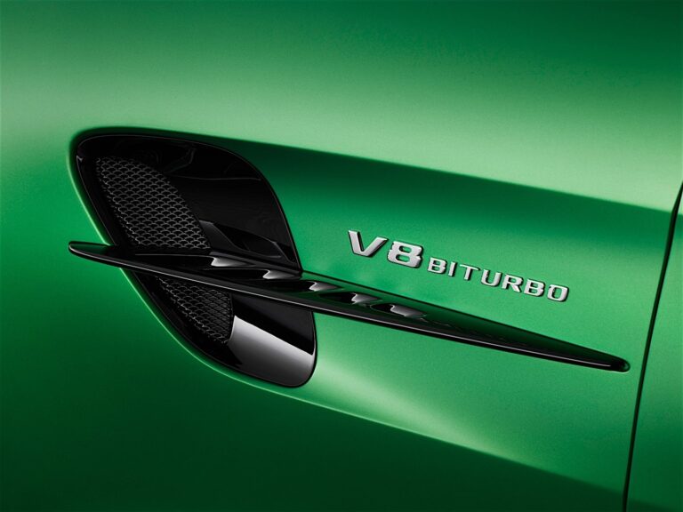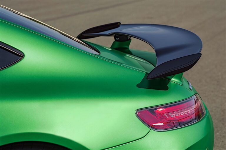 Przednie wzmocnienia z super lekkiego węgla zwiększają szerokość AMG GT R o łączną wartość 46 milimetrów z przodu, tworząc przestrzeń dla szerszego toru i dużych kombinacji kół/opon. Mocno rzeźbione nadkola dodatkowo podkreślają dynamikę wzdłużną. Kolejnym wyróżniającym elementem jest specjalna sygnatura skrzydła z finem i dużym otworem wentylacyjnym, przez który przepływa ciepłe powietrze z komory silnikowej. Ten fin jest perforowany i zawiera logo AMG w formie diamentu z pięcioma żebrami.