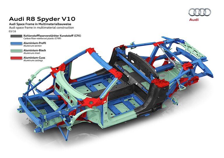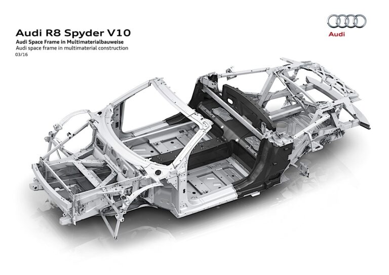 Kluczem do tej znakomitej wartości jest nowa Audi Space Frame (ASF), która wykorzystuje zasadę konstrukcji wielomateriałowej. Podobnie jak w R8 Coupé*, łączy komponenty aluminiowe z wbudowanym wzmocnieniem z włókna węglowego. Komponenty aluminiowe stanowią 79.6% wielomateriałowego ASF. W kolejności od wersji Coupé, tworzą one kratownicę, w której inżynierowie Audi wykorzystali specyficzne wzmocnienia, szczególnie w progach, słupkach A i ramie szyby. Innowacyjne metody produkcji obniżają wagę poszczególnych komponentów o nawet dziesięć procent. Całkowita masa ASF w nowym Audi R8 Spyder wynosi zaledwie 208 kilogramów (458.6 lb); ponadto jego sztywność skręcająca wzrosła o 50 procent w porównaniu do poprzedniego modelu. Osiągnął również najwyższe noty pod względem akustyki i bezpieczeństwa przy zderzeniach. Podwozie ma gładkie wykończenie, co poprawia aerodynamikę. A z tyłu, duży dyfuzor zwiększa docisk – to dwa rozwiązania prosto z motorsportu.
