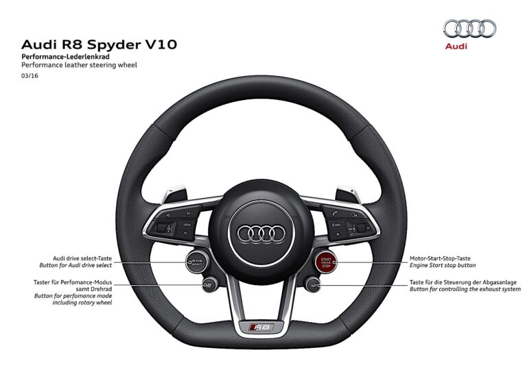 Koncepcja obsługi nowego Audi R8 Spyder V10 koncentruje się na kierowcy, jak w samochodzie wyścigowym. Kierowca może kontrolować wszystkie ważne funkcje z nowego sportowego lub wydajnego skórzanego koła kierowniczego. Jego ręce pozostają na kierownicy, aby mógł skoncentrować się w pełni na drodze. Do standardowych funkcji należy przycisk satelitarny do uruchamiania i zatrzymywania silnika oraz do systemu dynamicznego Audi drive select. Skórzane koło kierownicze ma dwa dodatkowe przyciski – jeden do trybu wydajności, a drugi do kontroli klap wydechowych.
