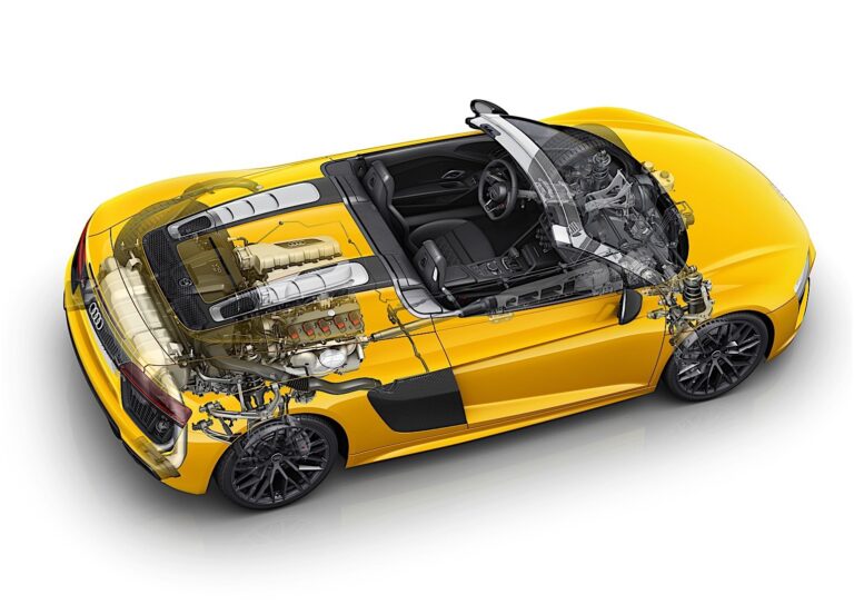 Nowe Audi R8 Spyder V10 imponująco pokazuje dynamiczny potencjał lekkiej konstrukcji samochodowej z masą własną wynoszącą 1,612 kilogramów (3,553.9 lb). Stosunek mocy do wagi wynosi zaledwie 3.19 kilogramów (8.6 lb) na hp.