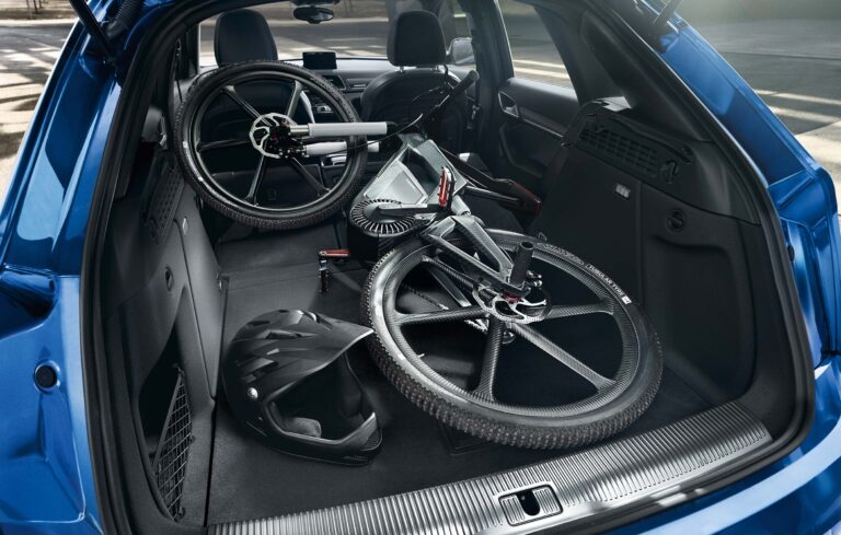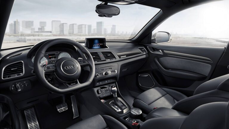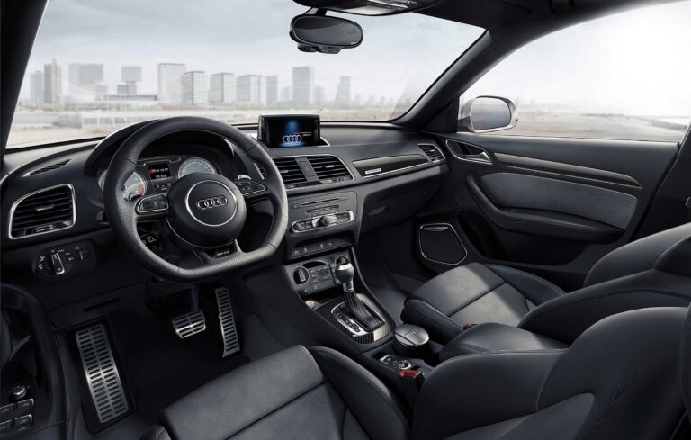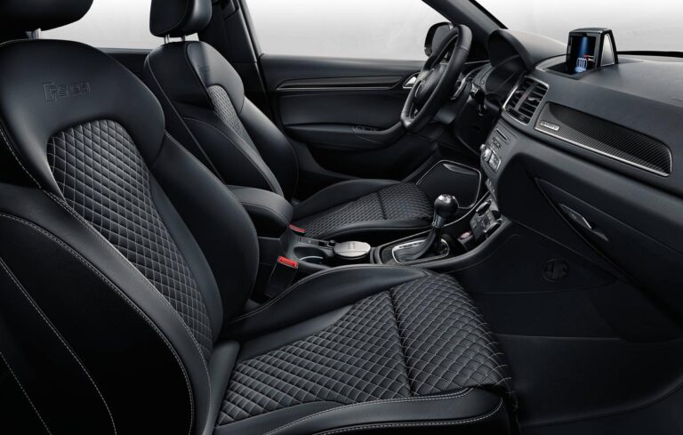 Dynamiczna linia zewnętrznego designu odbija się w wnętrzu pojazdu. Sportowe fotele z wytłaczanym logo RS Q3 są pokryte połączeniem czarnego Alcantary i skóry. Audi oferuje fotele w połączeniu kolorystycznym czarnym i niebieskim z opcjonalnym pakietem projektowym RS performance. Dynamiczny wzór perforacji na środkowej części fotela zwęża się dyfuzyjnie ku dołowi i tyłowi, a niebieski kolor prześwitujący tworzy wyjątkowe efekty kolorystyczne.