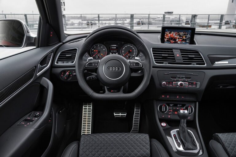 Zestaw wskaźników ma szare tło z białymi cyframi i czerwonymi wskazówkami. Kolorowy wyświetlacz systemu informacji kierowcy pokazuje ciśnienie doładowania, temperaturę oleju oraz czas okrążenia w specjalnym menu RS. Oprócz sportowych foteli, Audi RS Q3 performance standardowo oferuje w Niemczech także system parkowania plus, radio MMI, system audio Audi, automatyczną klimatyzację deluxe oraz reflektory LED.