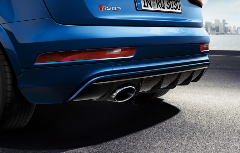 Typowe detale projektowe RS, takie jak sportowo zaprojektowane zderzaki z dużymi wlotami powietrza z przodu, błyszczące czarne kratki, tylny zderzak z wykrojem dyfuzora oraz system wydechowy RS z dużą owalną końcówką podkreślają sportowy charakter Audi RS Q3 performance.