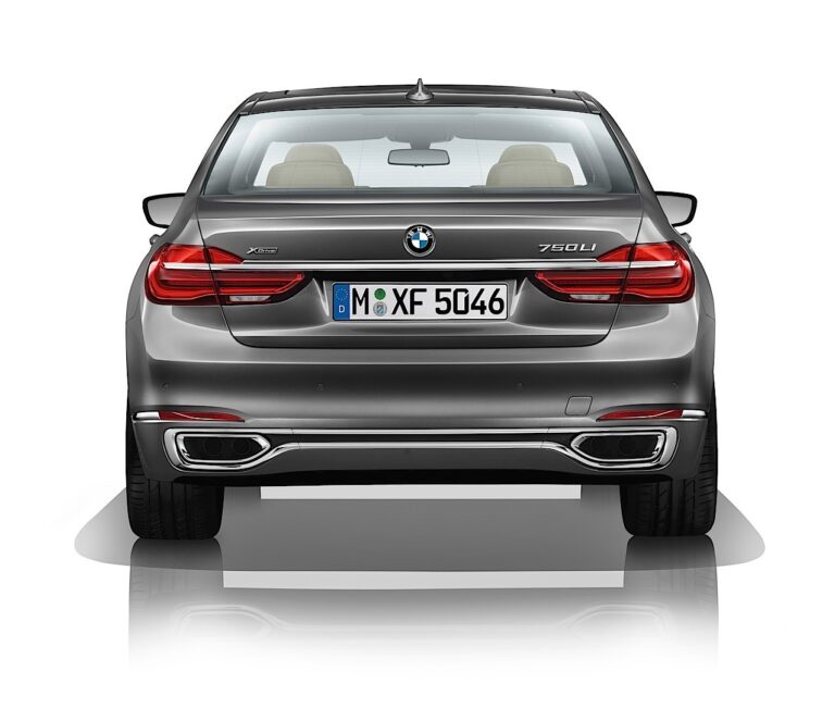 Kierunek podwójnej linii wygłówkowej rozciąga się do górnego konturu nadwozia i świateł tylnych. Tworzy to harmonijne połączenie między bocznymi sekcjami nowej serii BMW 7 a tyłem. Wszystkie źródła światła dla lamp tylnych wykorzystują technologię LED. Dwa L-kształtne jednostki świateł są połączone ze sobą chromowaną belką rozciągającą się na całą szerokość tylnej części, podczas gdy innym stylowym detalem jest tylna osłona w kształcie wydechów oprawionych chromowanymi obramowaniami.