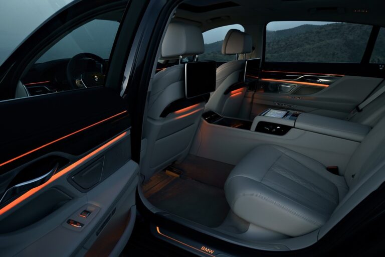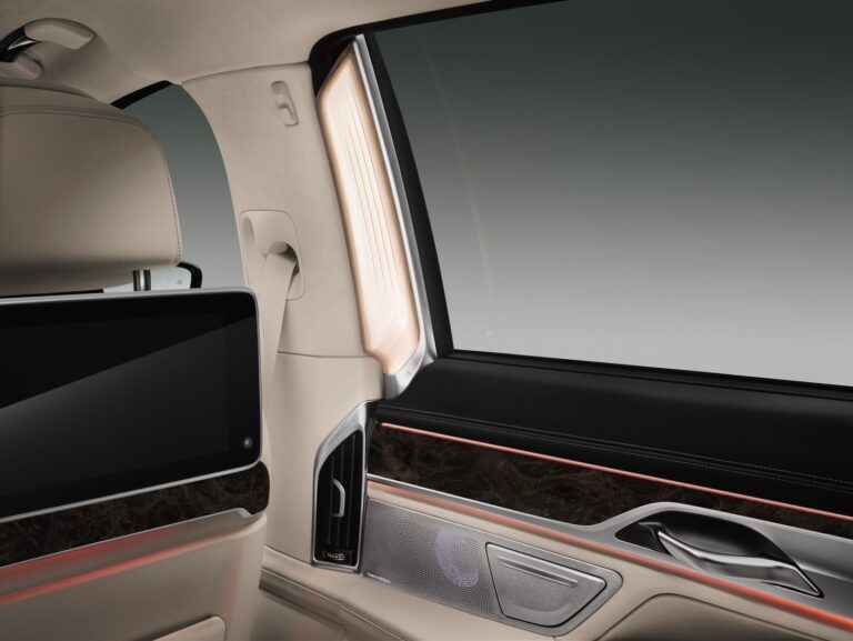 Ekskluzywna atmosfera we wnętrzu nowej serii BMW 7 jest również wzbogacona przez precyzyjnie dopasowane oświetlenie. Opcja Ambient light teraz obejmuje dywan powitalny, który zapewnia efektowne oświetlenie obszaru wokół drzwi samochodu. Inną unikalną cechą jest Ambient highlight dla przedłużonych wersji nowej serii BMW 7, która oświetla tylną część pojazdu w atmosferycznym świetle z źródeł światła umieszczonych pionowo na słupkach B.