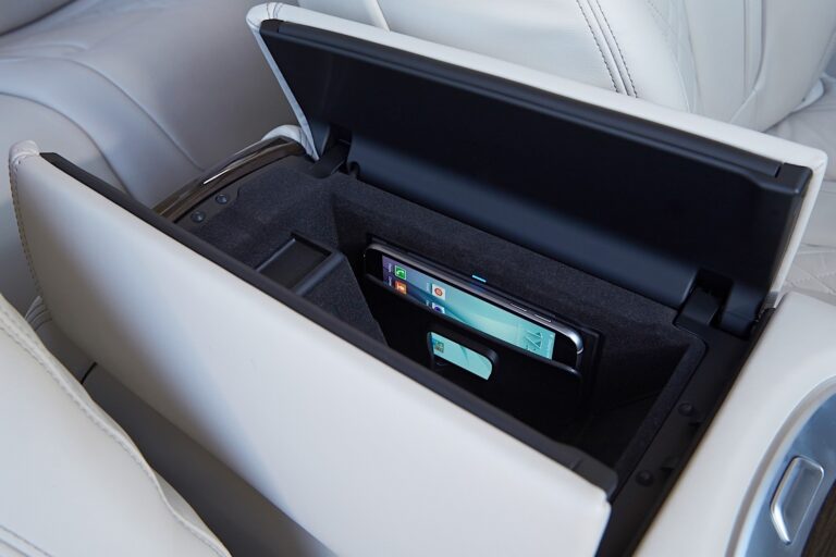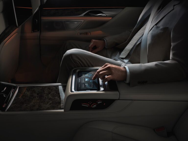 Tylna konsola Executive Lounge zawiera rozkładaną tabelę, dodatkowe uchwyty na kubki oraz system Touch Command. Ten przenośny tablet o przekątnej 7 cali pozwala użytkownikowi kontrolować funkcje infotainment i komfortu dostępne z tyłu nowej serii BMW 7, a także służy do odtwarzania zewnętrznych plików audio i wideo, jako konsola do gier lub do przeglądania internetu.