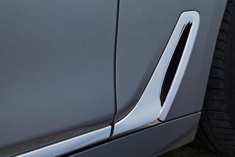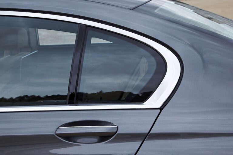 Obecność zakrzywionych powierzchni, gdy spojrzymy na nową serię BMW 7 z boku, nadaje pojazdowi potężny, przyciągający wzrok wygląd. Uchwyty do drzwi są precyzyjnie wkomponowane w linię charakterystyczną, która teraz przyjmuje formę podwójnej linii wygłówkowej. Obejmuje ona również ramkę okienną z Hofmeister kink, będącą od teraz jednolitą częścią po raz pierwszy w seryjnie produkowanym modelu, co podkreśla dbałość o detale nowej serii BMW 7. Element Air Breather w przednim panelu bocznym generuje chromowaną listwę, która biegnie wzdłuż dolnej krawędzi drzwi. To tworzy wysokiej jakości akcent, którego pozioma forma podkreśla starannie wyważony wygląd pojazdu i niski środek ciężkości. Lusterka zewnętrzne wydają się organicznie wyrastać z ramki okiennej, a smukły trzon stanowi jedyne połączenie między lusterkami a nadwoziem. Generując nowoczesny i elegancki efekt, ten design poprawia również aerodynamikę nowej serii BMW 7.