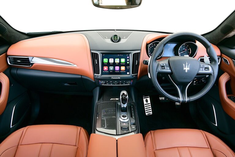 Najlepszym sposobem na personalizację Levante może być podniesienie do opcji pełnej skóry, gdzie panele drzwiowe i deska rozdzielcza są całkowicie pokryte wysokiej jakości skórą. Klient może również wybrać z szerszej gamy kolorów wnętrza i kombinacji oraz zdecydować się na kontrastowe przeszycia na siedzeniach i zagłówkach.