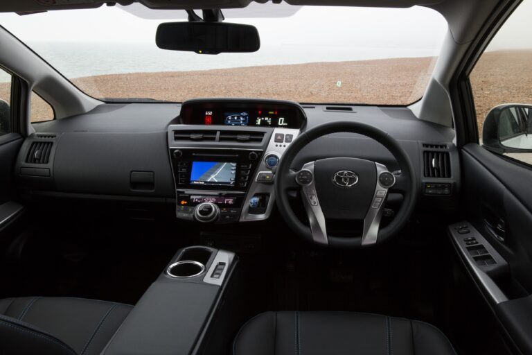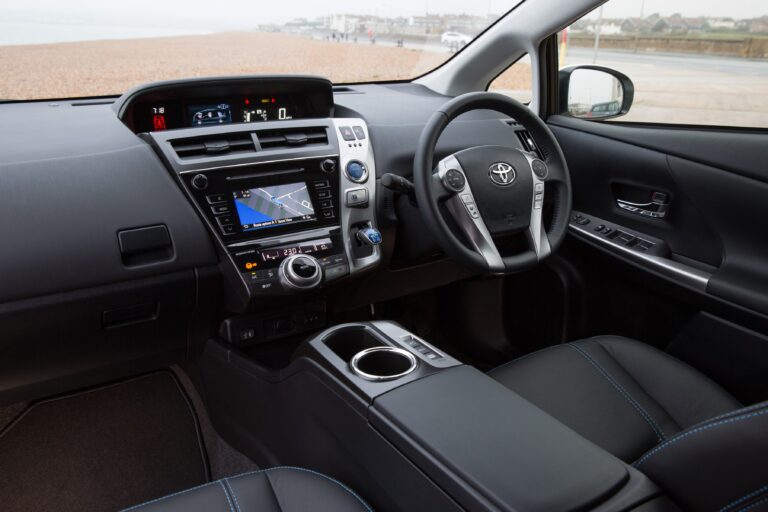 We wnętrzu zaszło więcej zmian niż na zewnątrz. Przednie, wysoko umieszczone siedzenia były dostępne w materiale SofTex, będącym sztuczną skórą. Tak jak pozostałe modele Priusa, Prius V miał deski rozdzielcze wykonane z materiałów recyklingowych, co nie wyglądało najlepiej w takim pojeździe, ale klienci to akceptowali. Rozumieli, że czasami trzeba zrezygnować z luksusowych udogodnień dla dobra Ziemi. Nowy wyświetlacz w kwadratowym zestawie wskaźników umieszczony na środku deski rozdzielczej dostarczał więcej i czytelniejszych informacji dla kierowcy, mimo ‘80sowego analogowego stylu. Dodatkowo, na centralnym panelu znajdował się 6.5-calowy system multimedialny Toyota Entune. W zależności od opcji, mógł oferować nawigację, muzykę oraz dostęp do internetu w celu uzyskania prognoz pogody i innych informacji. Środkowy rząd składał się z przesuwanych i rozkładanych trzech indywidualnych siedzeń, podczas gdy dwa tylne były odpowiednie dla dzieci.