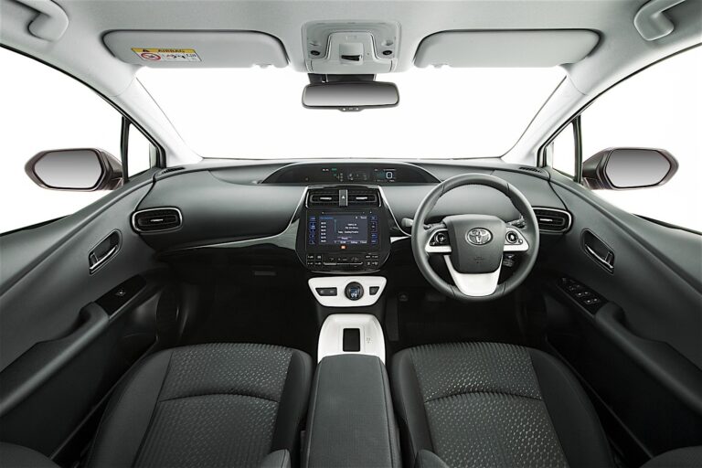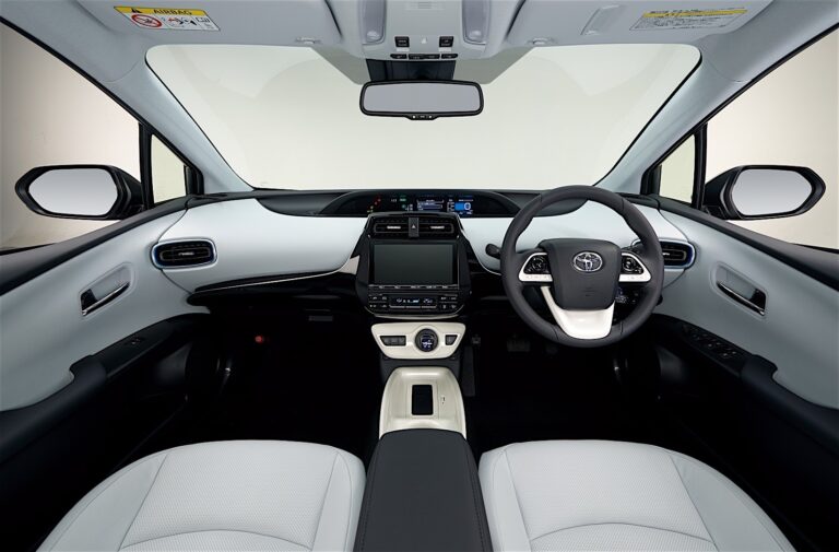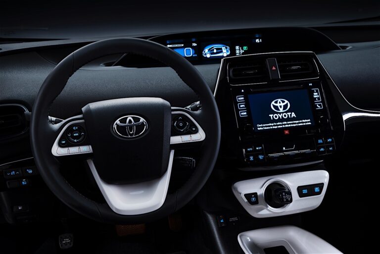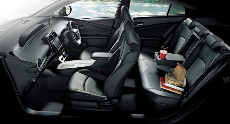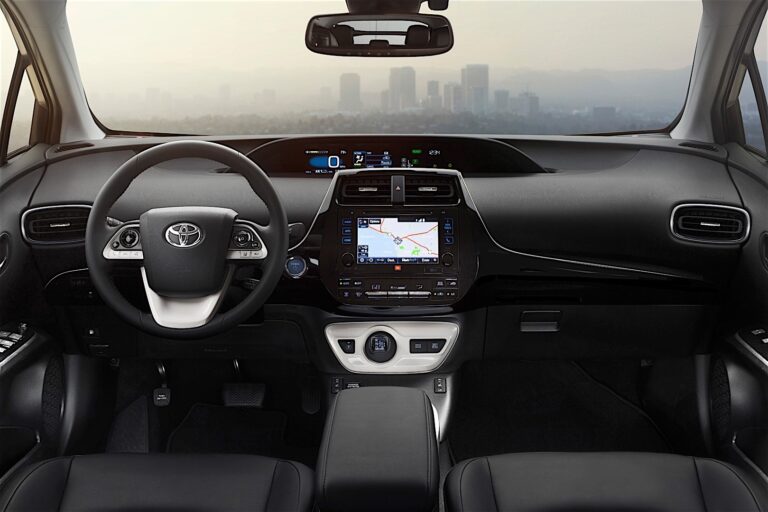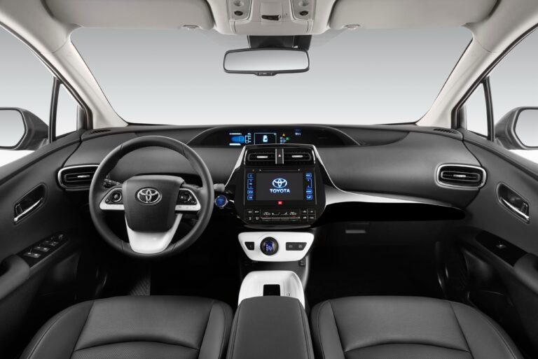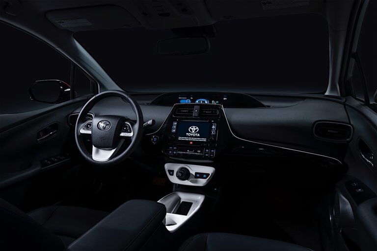 Wnętrze, platforma TNGA używana przez Toyotę, pozwoliła Priusa na wiele usprawnień również wewnątrz. Oprócz wydłużonego rozstawu osi, co skutkowało większą przestrzenią na nogi dla pasażerów siedzących z tyłu, samochód oferował wysoki poziom technologii pokładowej. Obejmuje również pakiet TSS (Toyota Safety Sense), który zawierał system wczesnego wykrywania kolizji z wykrywaniem pieszych, ostrzeżenie o zjeździe z pasa ruchu z asystą kierownicy, radarowy dynamiczny tempomat oraz automatyczne światła drogowe. Od pierwszej generacji Priusa, Toyota umieszczała panel instrumentów pośrodku deski rozdzielczej, bliżej szyby czołowej, i tam również umieściła go w czwartej generacji Priusa. Dodatkowo, w zestawie znajdował się wyświetlacz head-up, co było ulgą dla tych, którzy mieli trudności z odczytywaniem cyfr na wyświetlaczu cyfrowym. Ponadto, na górnej części konsoli centralnej, samochód miał ekran dotykowy systemu multimedialnego Entune Toyoty z dziewięcioma głośnikami JBL jako opcję.