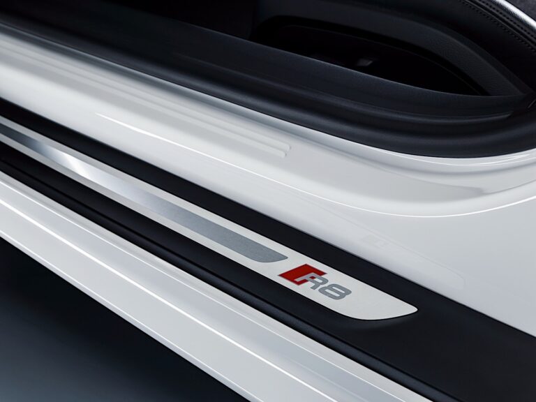 Z profilu R8 RWS można zauważyć kilka subtelnych zmian w porównaniu do standardowego R8 V10. Chociaż oba miały chromowane emblematy V10 na przednich błotnikach, lusterka RWS były w kolorze karoserii, a nie czarne. Ta sama barwa była stosowana na wlotach powietrza zamontowanych za drzwiami, podczas gdy w R8 V10 i R8 V10 Plus były one czarne. To były drobne detale, które Audi chciało, aby jego fani odkryli. Na koniec, z tyłu producent umieścił matowe czarne kratki w tylnej wentylacji, które uwalniały powietrze uwięzione w nadkolach. Na dolnej części zderzaka zamontowano masywny dyfuzor otoczony parą prostokątnych wydechów o chromowanej powierzchni. To były jedyne błyszczące elementy na zewnętrznej części samochodu. Wszystkie inne detale były czarne.