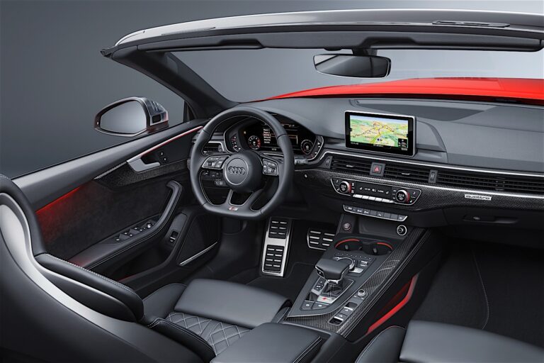 Przy zamkniętym dachu bagażnik ma pojemność 380 litrów. Komora na miękki dach w bagażniku automatycznie opada przy otwieraniu dachu i podnosi się ponownie, gdy dach jest zamknięty, zapewniając maksymalną przestrzeń bagażową w każdej chwili. Tylne siedzenie dzieli się w proporcji 50:50 i można je łatwo złożyć do przodu za pomocą dźwigni w bagażniku. Standardowo tylna klapa w A5 Cabriolet teraz otwiera się automatycznie – za pomocą pilota lub przycisku w drzwiach kierowcy. Audi wyposażone jest również w opcję sterowania gestami dla tylnej klapy: czujnik zbliżeniowy w zderzaku reaguje na ruch nogą – tylna klapa otwiera się automatycznie, gdy wykryty jest opcjonalny kluczyk komfortowy.