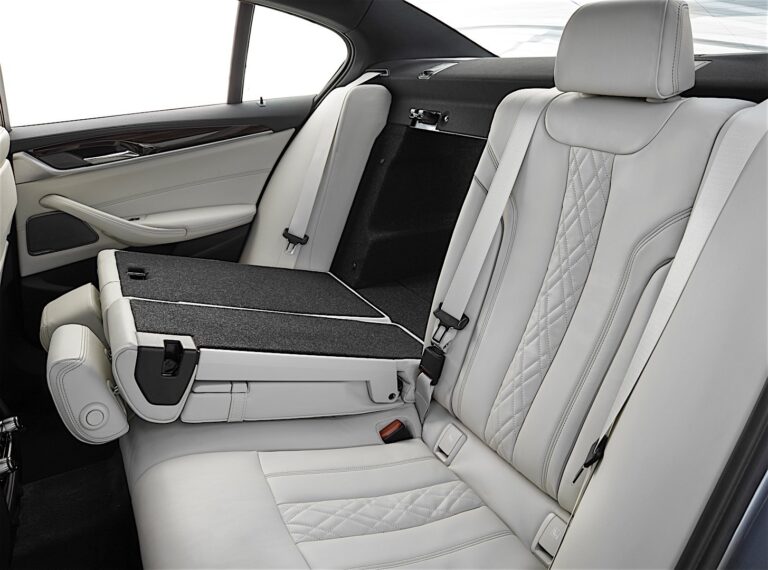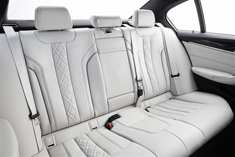 Niska linia dachu płynnie przechodzi w tył, ale nowy BMW 5-Series oferuje znacząco więcej miejsca na głowę z tyłu oraz zwiększoną pojemność bagażnika wynoszącą 530 litrów. Wnętrze samochodu wydaje się znacznie bardziej przestronne, co można przypisać nie tylko obniżonej desce rozdzielczej i stojącemu wyświetlaczowi, ale także zwiększonym wymiarom kabiny, szczególnie w zakresie miejsca na łokcie i ramiona. Pasażerowie z tyłu mają teraz więcej miejsca na rozłożenie się, dzięki zwiększonemu miejscu na kolana i przedłużonemu miejscu na nogi, podczas gdy zoptymalizowany projekt otworów drzwiowych ułatwia wsiadanie jak nigdy dotąd.
