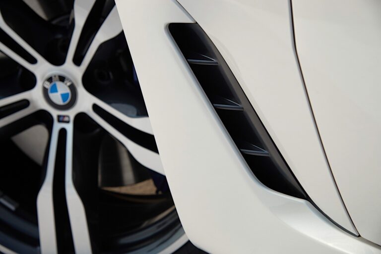 Duża atrapa chłodnicy BMW podkreśla muskularną obecność przedniej części. Jednostki reflektorów sięgają aż do nerek, tworząc ciągłą linię, która akcentuje szerokość samochodu.