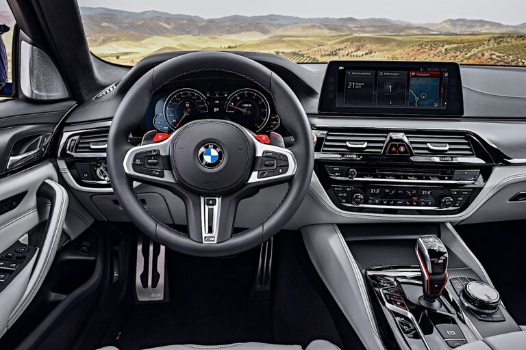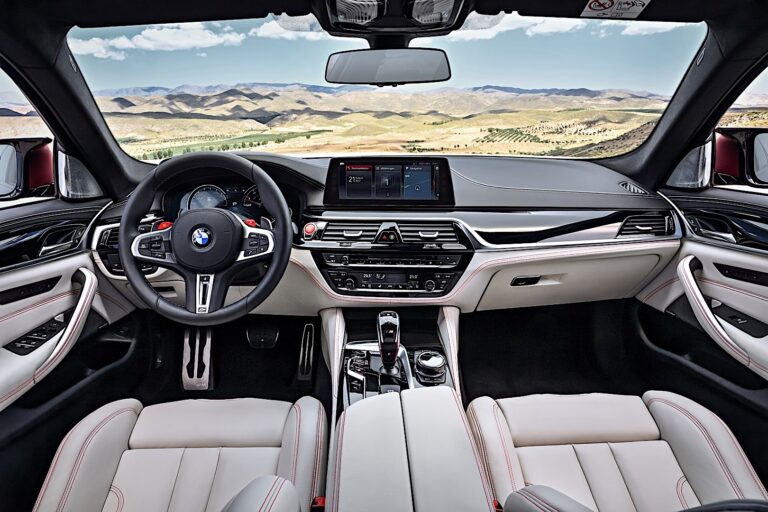 Wnętrze samochodu oferowało niemal wszystko, czego mógłby oczekiwać klient od takiego sportowego sedana. Jego skórzana tapicerka Merino, kolorowy wyświetlacz head-up oraz szeroki ekran informacyjny na szczycie centralnej konsoli były standardem. Dodatkowo cyfrowy zestaw wskaźników dostarczał wszelkich danych potrzebnych każdemu, kto wiedział, jak odpowiednio wykorzystać możliwości M5. Co więcej, wysoko profilowane fotele kubełkowe zapewniały pasażerom, że pozostaną na swoim miejscu, niezależnie od prędkości pokonywanej zakrętu. Z tyłu dzielona kanapa była profilowana dla dwóch osób, ale producent zamontował trzy pasy bezpieczeństwa, na wypadek, gdyby ktoś chciał usiąść nad tunelem skrzyni biegów.
