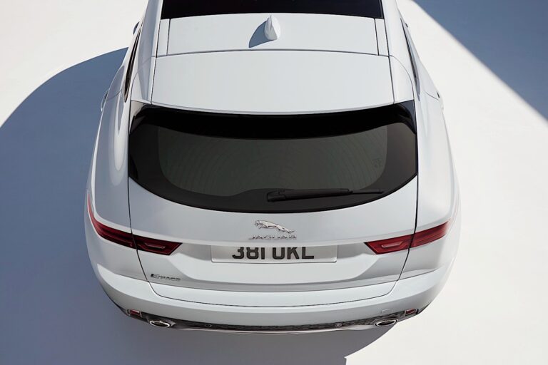 Z tyłu, napięte powierzchnie i muskularne barki łączą się z ostrymi liniami tylnych zespołów świateł. Smukłe, przypominające ostrze tylne lampy mają pełną technologię LED i są kolejnym znakiem wspólnego DNA E-Pace z flagowym samochodem sportowym Jaguara.