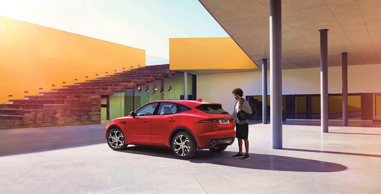 E-Pace łączy dynamiczny język ciała i proporcje samochodu sportowego Jaguara z przestrzenią, bezpieczeństwem i funkcjonalnością typową dla kompaktowego SUV-a.
