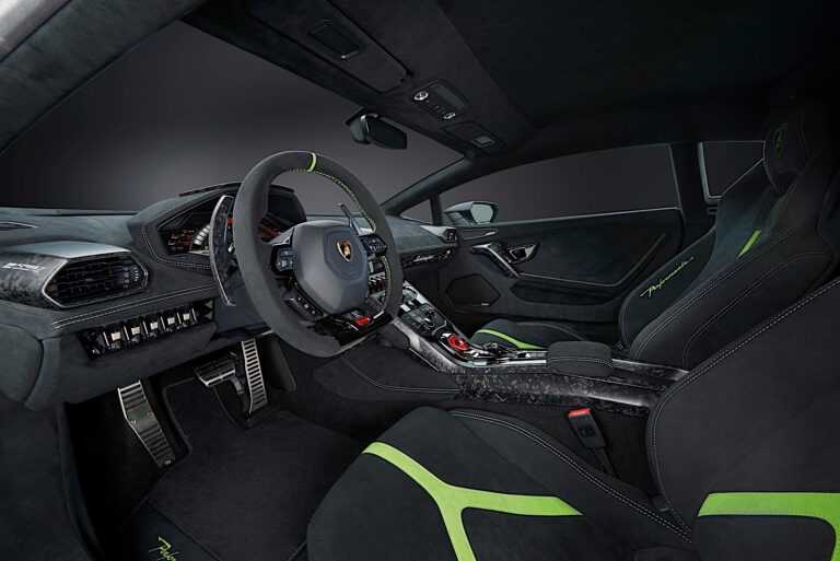 Wnętrze Huracán Performante przypomina kierowcy o jego lekkiej i aerodynamicznej naturze. Wloty powietrza, łopatki, klamki drzwiowe i konsola centralna są wykonane z Forged Composite. Nawiązując do swojego wyścigowego dziedzictwa, w całym wnętrzu zastosowano lekkie, ciemne włókno Alcantara, w tym na sportowych fotelach, na których można wygrawerować opcjonalny wzór „Y”. Fotele komfortowe w tym samym wykończeniu są dostępne jako alternatywa.