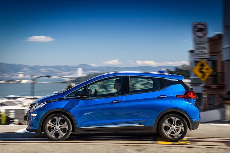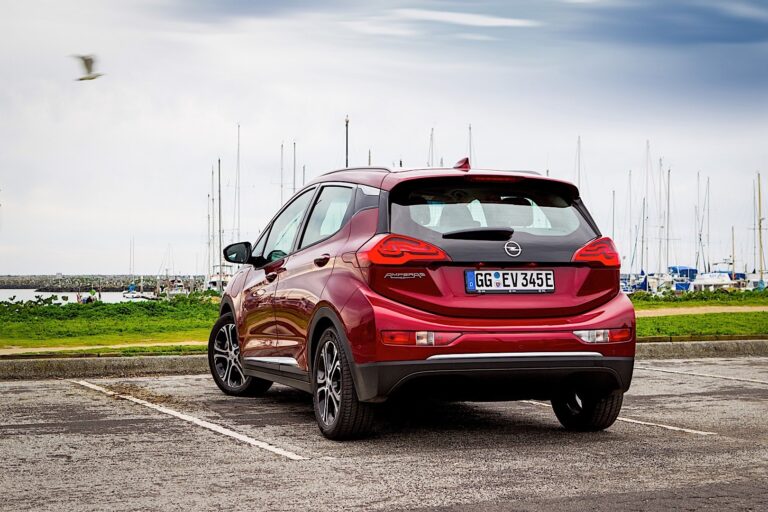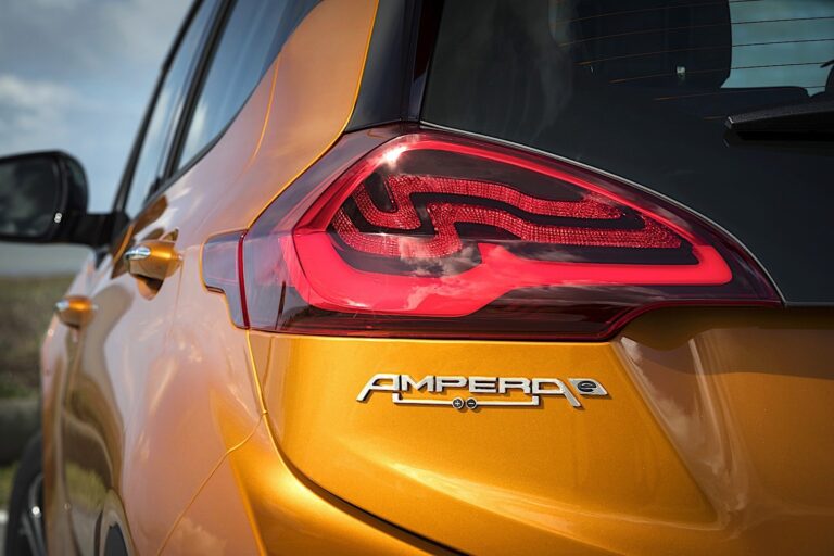 Z profilu, subkompaktowy hatchback o kształcie minivana ujawniał swoje zamiary jako codzienny towarzysz do miejskich dojazdów. Jego wysokie drzwi i przeszklona część nadwozia, przestronna strefa okien oraz wznosząca się linia okien była stworzona dla tych, którzy szukają przestronnego pojazdu dla rodziny. Niemniej jednak, Opel Ampera-e z 2017 roku miała kilka detali designu, które sprawiały, że wyglądała nieco bardziej wyjątkowo niż większość innych aut w tym segmencie. Na przykład, czarna listwa wizualnie łączyła reflektory z słupkami A, natomiast z tyłu, błyszczący czarny element dekoracyjny zamontowany na słupkach C tworzył efekt „latającego dachu”. Pomimo czarnych detali wokół nadkoli i aluminiowych felg, samochód nie był crossoverem. Na koniec, z tyłu producent dodał poziome światła tylne, które rozciągały się od tylnych błotników aż po klapę bagażnika. Spoiler dachowy dopełniał aerodynamikę pojazdu. Nie był tam tylko dla efektu wizualnego, ale także w celu obniżenia oporu powietrza i poprawy zasięgu samochodu.