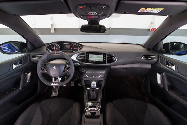 Wnętrze samochodu podkreślało jego sportowy charakter, oferując fotele sportowe z wysokim podparciem, zintegrowane zagłówki. Kierowca miał przed sobą zegary w stylu lornetki, jak w standardowym modelu 308, ale z czerwonymi iluminacjami na tarczach. Producent dodał mały wyświetlacz TFT, który pokazywał dodatkowe informacje z pokładowego komputera między prędkościomierzem a obrotomierzem. Płaski, dolny koło kierownicy z logo GTi na dolnym ramieniu oraz aluminiowe pedały dopełniały obraz prawdziwego hot-hatcha. Z tyłu, kanapa dzielona 60/40 miała te same materiały, co fotele przednie.