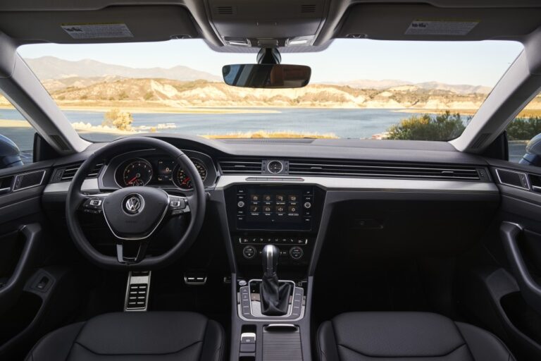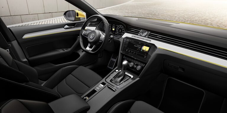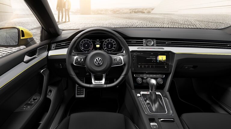Sposób, w jaki linia, zaprojektowana jako jedność wizualna deski rozdzielczej i ramion drzwi, wydaje się owijać pięciu pasażerów jak kokon, jest nietypowy i unikalny. Horyzontalnie zorientowana deska rozdzielcza przechodzi homogennie w panele wzornicze przednich drzwi. Zespół, kierowany przez Tomasza Bachorskiego, szefa wzornictwa wnętrza Volkswagena, zaprojektował deskę rozdzielczą o uproszczonym układzie, która biegnie wprost z czystym i ikonicznym designem. Głównym elementem designu deski rozdzielczej jest innowacyjny wentyl – zaprojektowany jako funkcjonalny, a jednocześnie dekoracyjny element – który rozciąga się na całą szerokość wnętrza jak pas. Ten efekt dopełniają delikatne chromowane listwy ozdobne na żaluzjach wentylacyjnych, które tworzą wizualne połączenie z poprzecznymi listwami nowo opracowanej osłony chłodnicy Volkswagena Arteona.