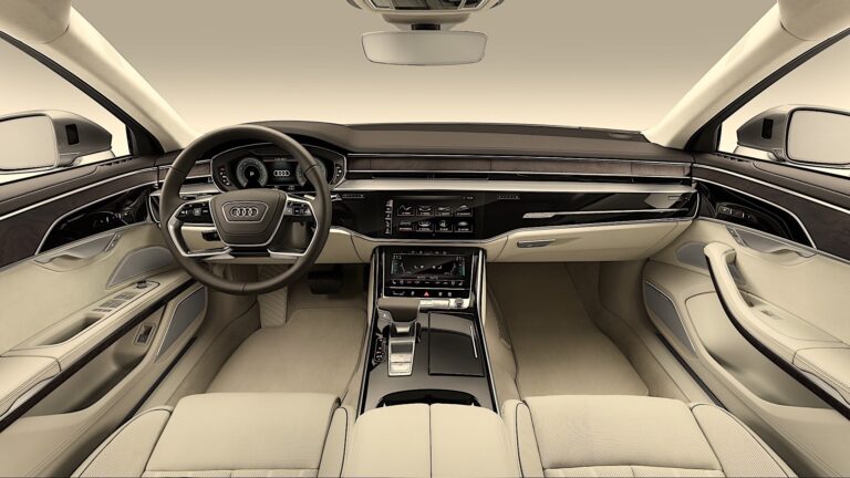 Wnętrze luksusowej limuzyny celowo przyjmuje minimalistyczny design; architektura wnętrza jest jasna i ma wyraźnie poziomą orientację. Audi przenosi swoje wysokie standardy jakości do ery cyfrowej z radykalnie nowym konceptem obsługi. Rezygnuje z znanego pokrętła i touchpada z poprzedniego modelu. Panel wskaźników jest w dużej mierze wolny od przycisków i przełączników. W jego centrum znajduje się wyświetlacz dotykowy o przekątnej 10,1 cala, który, gdy jest wyłączony, prawie niewidocznie wtapia się w połyskujący czarny otok dzięki efektowi czarnej płyty.