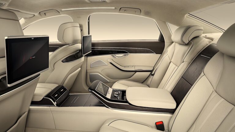 Najbardziej eleganckie miejsce w nowym Audi A8 znajduje się z tyłu z prawej strony – opcyjny fotel relaksacyjny w Audi A8 L, który posiada cztery różne opcje regulacji i podnóżek. W tym fotelu pasażer może podgrzewać i masować stopy na jednostce z różnymi ustawieniami umieszczonymi w oparciu fotela pasażera. Nowe komfortowe zagłówki dopełniają doświadczenie. Pasażerowie z tyłu mogą również kontrolować szereg funkcji, takich jak oświetlenie ambientowe, nowe czytniki świateł HD Matrix oraz masaż siedzenia, a także wykonywać prywatne połączenia telefoniczne, za pomocą osobnego urządzenia sterującego. Zdalne sterowanie tylnego siedzenia, z wyświetlaczem OLED wielkości smartfona, to przenośna jednostka umieszczona w centralnej konsoli.