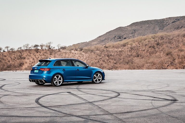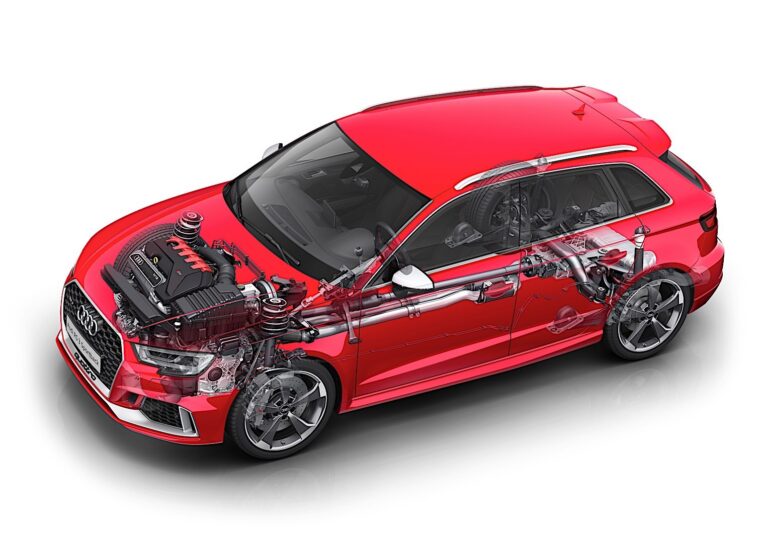 Wraz z progresywnym układem kierowniczym, tylną osią na czterech wahaczach oraz twardym zawieszeniem obniżonym o 25 mm w porównaniu do A3, RS3 Sportback łączy fascynującą dynamikę z doskonałą stabilnością. W porównaniu do wersji produkcyjnej, rozstaw kół przednich RS3 Sportback jest szerszy o 20 mm – a nadkola są odpowiednio poszerzone. W standardzie Audi oferuje 19-calowe felgi aluminiowe oraz opony 235/35, a także tarcze hamulcowe o średnicy 310 mm. Alternatywnie, klienci będą mogli wybrać ceramiczne tarcze hamulcowe z włókna węglowego z przodu. Z tyłu znajdują się tarcze hamulcowe o średnicy 310 mm.