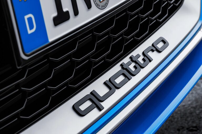 Na zewnątrz Audi RS3 Sportback demonstruje swoją moc w postaci wyrazistej atrapy chłodnicy Singleframe z błyszczącą czarną kratką, dużymi wlotami powietrza i kanciastymi listwami progowymi. Przeprojektowany element w zderzaku nadaje przedniej części jeszcze szerszy wygląd. Na końcach tworzy wąskie, pionowe leje. Standardowo występują reflektory LED z charakterystycznym sygnaturą świetlną, a Audi oferuje matrycowe reflektory LED jako opcję. Z tyłu stylowy spojler dachowy RS, wkładka dyfuzora oraz duże owalne rury wydechowe systemu RS z pewnością przyciągną wzrok. Logo quattro na dole atrapy Singleframe to doskonałe dopełnienie dynamicznego wyglądu, podobnie jak emblemat RS3 na kratce i klapie bagażnika.