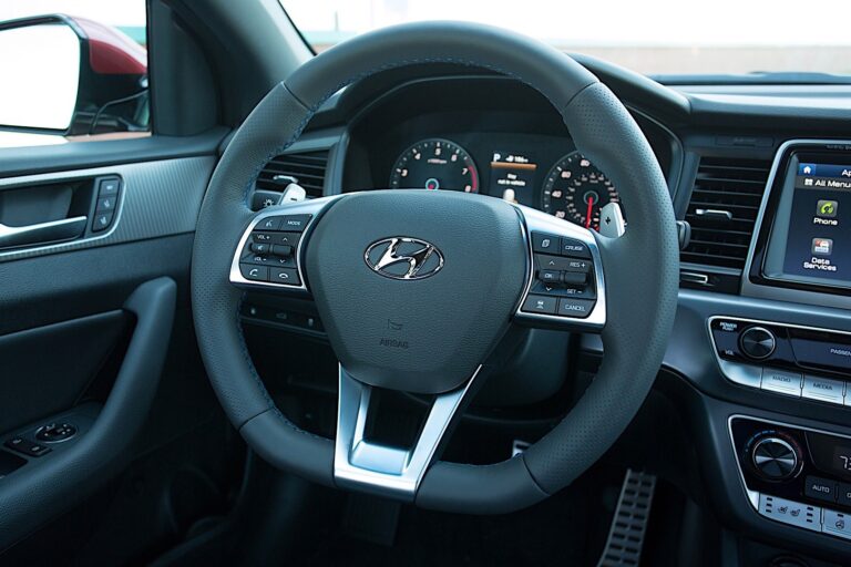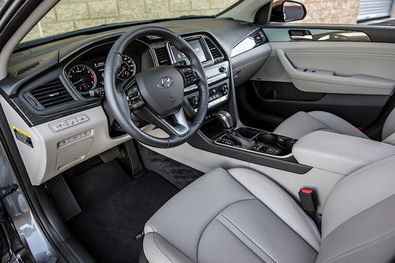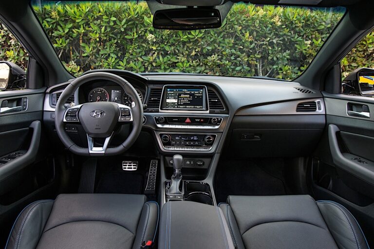 Wnętrze wszystkich wersji zostało wyposażone w panel instrumentów, w którym dominował 4,2-calowy kolorowy wyświetlacz TFT. Duże wskazówki obrotomierza i prędkościomierza flankowały go, a także integrowały wskaźniki temperatury wody i poziomu paliwa. Wraz z odświeżoną siódmą generacją Sonaty, Hyundai wprowadził również opcję ośmiocalowego ekranu dotykowego z Apple CarPlay i Android Auto. To była jedna z najważniejszych zmian w gamie Sonaty. Centralny panel również zyskał nowe przyciski klimatyzacji i radia. Z tyłu producent zamontował wygodną kanapę dla trzech dorosłych osób. Wysokość sufitu nie była imponująca, ale poza tym, był to świetny pojazd dla czteroosobowej rodziny z dorosłymi dziećmi.