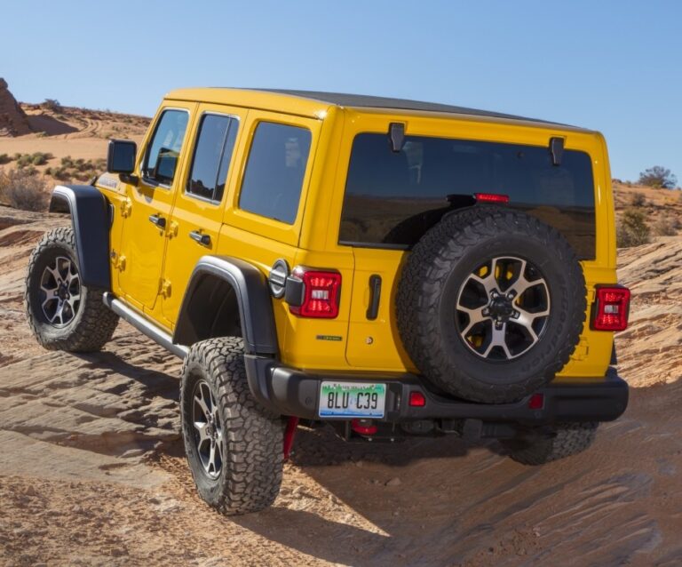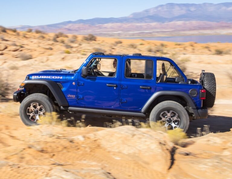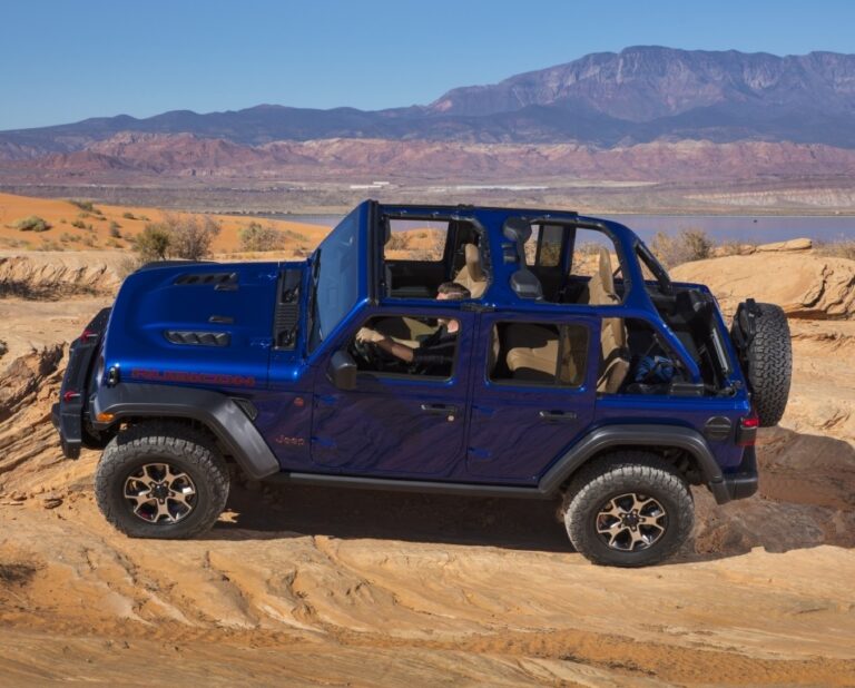 Z boku, Wrangler JL Rubicon miał bardziej pochyloną szybę i zaokrąglone narożniki niż jego poprzednik. Posiadał zaokrąglone słupki A, co poprawiało aerodynamikę, mimo że ogólny kształt samochodu był bliższy cegle niż kropli wody. Producent zaoferował pojazd z rurami ochronnymi biegnącymi między osiami, aby chronić nadwozie. Jego ogromne, 33-calowe opony były zaprojektowane z myślą o maksymalnej przyczepności podczas jazdy w terenie, co również podniosło prześwit w porównaniu do jego nie-Rubiconowych wersji. Jeep nie zapomniał też o zamontowaniu zdejmowanych drzwi, które były wykonane z aluminium, aby zaoszczędzić wagę. Dla modelu z 2019 roku dostępny był zestaw pół-drzwi. Z tyłu, na stelażu wspierającym pełnowymiarowe koło zapasowe, zamontowanym do tylnych drzwi otwieranych na bok, producent zainstalował kamerę cofania.
