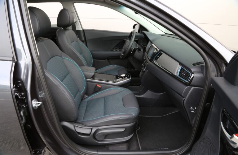 Deska rozdzielcza ma jasnoniebieskie akcenty wokół otworów wentylacyjnych, nawiązując do akcentów znajdujących się na zewnątrz samochodu. Kabina wykończona jest w wyborze materiałów tekstylnych i sztucznej skóry, pełnej sztucznej skóry lub prawdziwej skóry. W każdej wersji dostępna jest w kolorze czarnym lub ciemnoszarym, lub w dedykowanym nowym schemacie kolorystycznym wnętrza Kia e-Niro z czarnym wykończeniem i jasnoniebieskimi przeszyciami, nawiązującymi do kolorowych akcentów na zewnętrznej stronie pojazdu. W samochodach wykończonych skórą i sztuczną skórą, perforowana tapicerka ma intensywny niebieski wkład, co dodatkowo podkreśla niebieskie detale w kabinie oraz na zewnątrz samochodu.