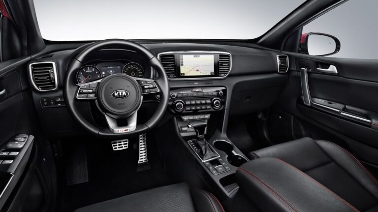 Wnętrze Sportage przeszło zmiany, prezentując nowo zaprojektowaną kierownicę oraz poprawioną deskę rozdzielczą. Modele GT Line oferują opcję czarno-szarych, dwukolorowych skórzanych siedzeń lub czarnych skórzanych foteli z czerwonymi akcentami.