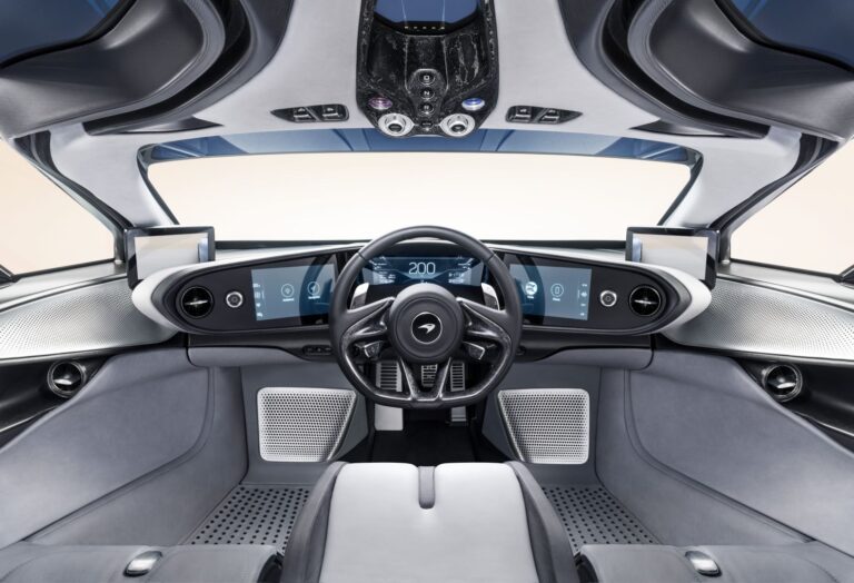 Wewnątrz klienci mogli znaleźć kokpit w stylu McLaren F1. Fotel kierowcy znajdował się na środku, a po bokach, w zagłębionych pozycjach, były fotele pasażerów. Przed kierowcą znajdowała się cyfrowa tablica rozdzielcza, z lewej strony z ekranem dotykowym do klimatyzacji, a z prawej dotykowym panelem jednostki multimedialnej. Nad kierowcą umieszczono przyciski start/stop, selektory biegów (PRND) oraz przyciski szyb elektrycznych. Było to unikalne rozwiązanie, niespotykane w innych samochodach. Starannie wykonane elementy z włókna węglowego otaczały wnętrze, a McLaren wykorzystał ten materiał do siedzeń, paneli drzwiowych, łopatek zmiany biegów oraz kierownicy.