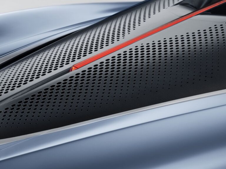 Elegancję stworzono przez redukcję: każdy panel nadwozia jest wykonany z włókna węglowego i został uformowany w celu obniżenia oporu; chowane cyfrowe kamery tylne zastępują tradycyjne lusterka, co dodatkowo wspomaga osiągi aerodynamiczne; statyczne pokrywy aerodynamiczne na przednich kołach redukują turbulencje powietrza wokół nadkoli; a bezszwowa sylwetka jest wzmacniana przez zmniejszenie liczby linii zamknięcia – w tym jednoczęściowy tylny klapowy – które nie zakłócają wizualnej ciągłości nadwozia ani przepływu powietrza nad nim. Patentowane aktywne tylne lotki zapewniają, że ciągłość designu pozostaje nienaruszona, a opór jest utrzymywany na minimalnym poziomie.