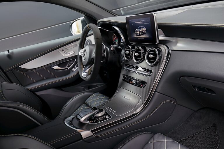 Deska rozdzielcza wykończona jest czarną sztuczną skórą ARTICO z kontrastowymi szwami. Wysokiej jakości wygląd podkreśla aluminium. Touchpad jest otoczony przez przełącznik AMG DYNAMIC SELECT i liczne przyciski specyficzne dla AMG, takie jak przycisk do 3-stopniowego zawieszenia AMG RIDE CONTROL, 3-stopniowego ESP® czy opcjonalnego przycisku do sportowego układu wydechowego AMG z kontrolą klap.