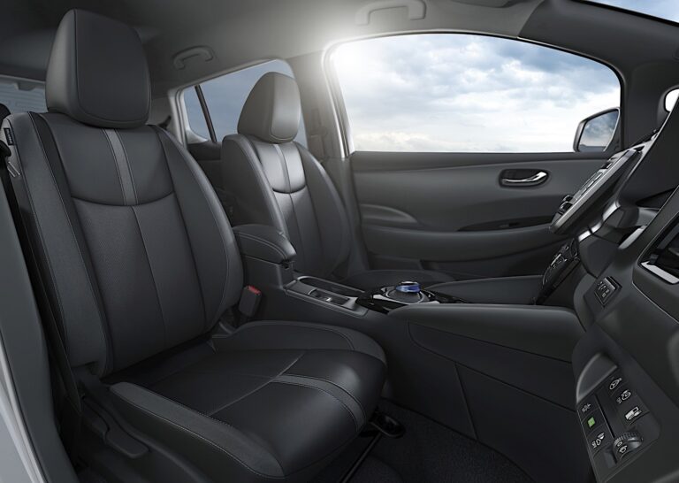 Pierwsza generacja Leaf’a była krytykowana za niewystarczającą ilość przestrzeni wewnętrznej dla czterech dorosłych pasażerów. Nissan to poprawił, zwiększając rozstaw osi, co pozwoliło na powiększenie wysokości kabiny. W efekcie pasażerowie z przodu siedzieli na wysoko umieszczonych siedzeniach z delikatnym wyprofilowaniem. Kierowca miał przed sobą w pełni cyfrowy zestaw wskaźników oraz kierownicę z płaskim dnem.