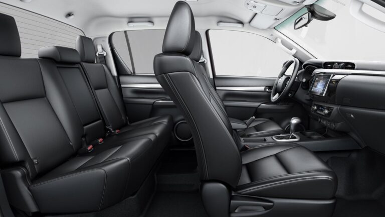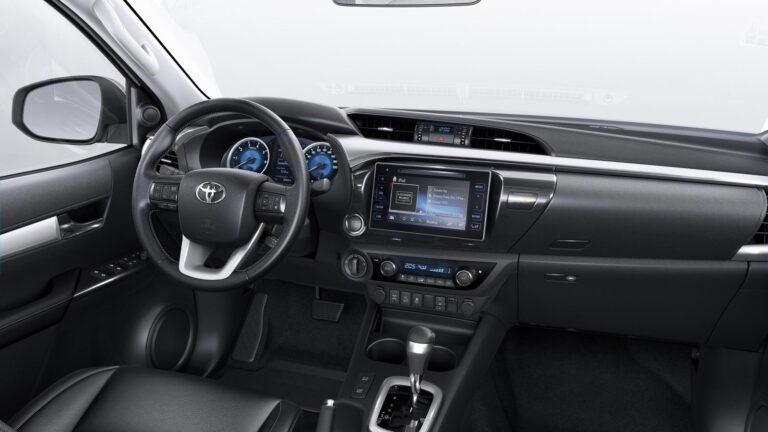 Wewnątrz, deska rozdzielcza pozostała praktycznie taka sama jak w wersji bez zmiany, choć z kilkoma drobnymi ulepszeniami. Panel instrumentów miał nowe wskaźniki z białymi obramowaniami i pomarańczowymi wskazówkami zamiast niebieskich i szarych jak w poprzedniku. Jednak 4.6-calowy kolorowy wyświetlacz TFT pomiędzy obrotomierzem a prędkościomierzem pozostał bez zmian. System infotainment w Toyota HiLux Double Cab z 2018 roku również pozostał z poprzedniego modelu.