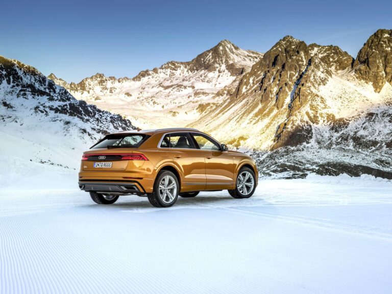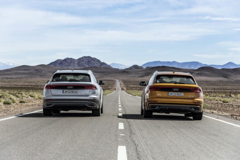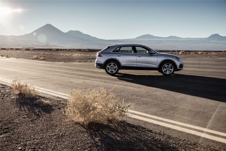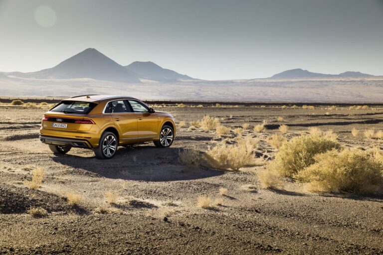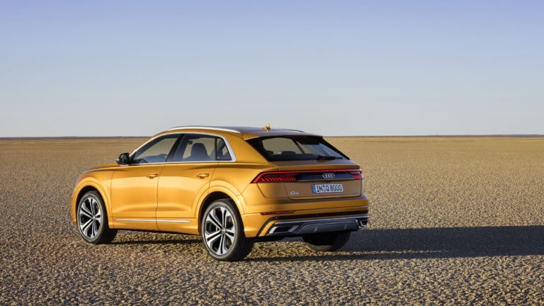 Nowy Audi Q8 ma długość 4,986 mm, szerokość 1,995 mm i wysokość 1,705 mm, emanując obecnością na drodze, jak żaden inny SUV tej marki z czterema pierścieniami. Z charakterystyczną linią dachu w stylu coupé wydaje się znacznie niższy niż jego siostra Q7. Jest o 66 mm krótszy, ale zyskał 27 mm na szerokości. Wyrazista przednia część, krótki tył oraz potężne 21-calowe koła o średnicy 795 mm tworzą obraz potężnej dynamiki. W Wielkiej Brytanii wersja S line, która oferuje szereg standardowych funkcji, takich jak sportowe, adaptacyjne zawieszenie powietrzne oraz MMI Navigation Plus z MMI Touch, a także reflektory HD Matrix LED, będzie dostępna od momentu wprowadzenia na rynek. Wkrótce później do oferty dołączy jeszcze bardziej kompleksowo wyposażona wersja Vorsprung.