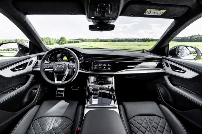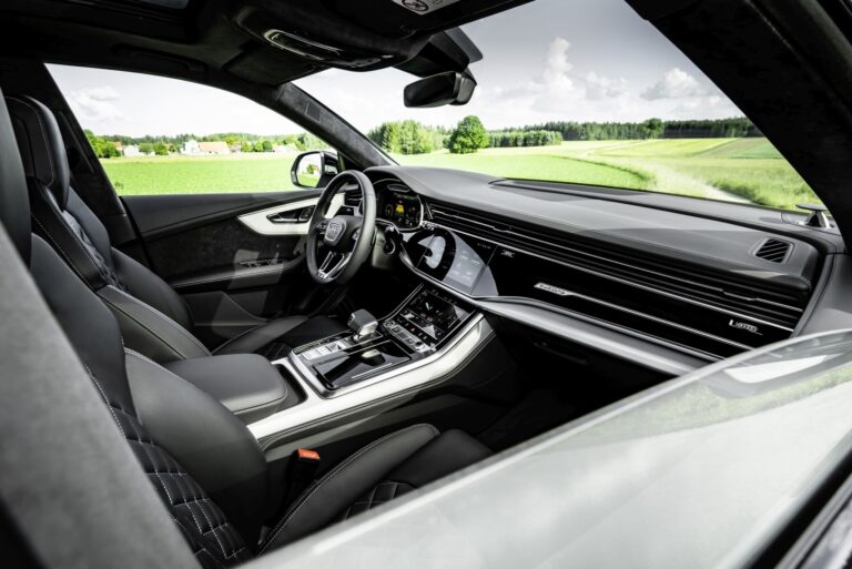 Smukła deska rozdzielcza oraz spokojne linie z silnym poziomym układem podkreślają wrażenie szerokości wnętrza Audi Q8. Stylizacja wnętrza jest celowo czysta i prosta. Wszystkie elementy mają logiczne połączenie i harmonizują ze sobą: od „wrap around” – dużego łuku rozciągającego się od przednich drzwi przez panel instrumentów – po jednostkę sterującą oświetleniem, która ma wykończenie w czarnym panelu z powierzchnią dotykową. To wszystko razem tworzy wrażenie spokoju we wnętrzu.