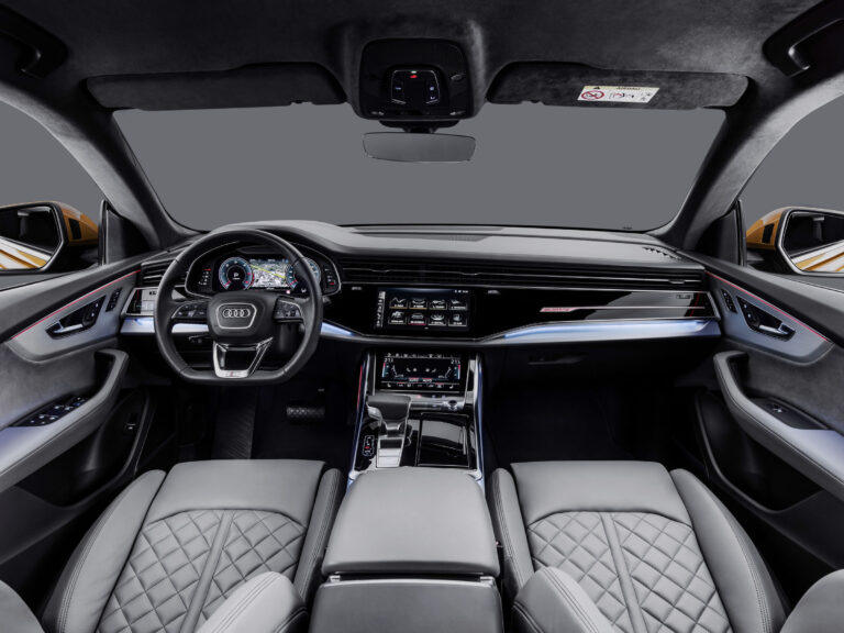 Wnętrze Audi Q8 pozwala klientom wybierać spośród kilku kolorów i konfiguracji. W konfiguracji S line przednie sportowe fotele zintegrowanymi zagłówkami, logo S i wzorem rombów są tapicerowane skórą/alcantarą, z możliwością zamówienia oddzielnie skór Valcona. W standardzie oferowane są wstawki w aluminium dla wyraźnego kontrastu wnętrza.