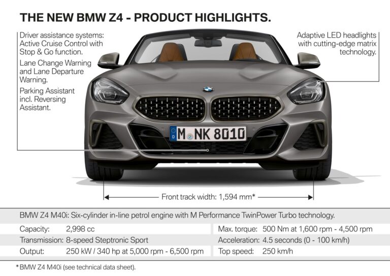 Linia modelowa roadstera jest prowadzona przez wersję BMW M Performance. Nowy BMW Z4 M40i uzyskuje moc potrzebną do zachwycających osiągów z 3,0-litrowego silnika rzędowego o sześciu cylindrach, który łączy błyskawiczną reakcję, żarłoczność przy obrotach oraz gładkość z poprawioną wydajnością i zmniejszonymi emisjami. Wyróżniające cechy nowej jednostki mocy to chłodzony wodą kolektor wydechowy zintegrowany z głowicą cylindrów, szybsza reakcja turbosprężarki oraz lepsza przyspieszenie, a także technologia bezpośredniego wtrysku, która teraz działa pod zwiększonym maksymalnym ciśnieniem 350 bar. Kierowcy otrzymują moc maksymalną wynoszącą 250 kW/340 hp przy obrotach od 5 000 do 6 500 rpm, a maksymalny moment obrotowy 500 Nm (369 lb-ft) można uzyskać w zakresie od 1 600 do 4 500 rpm.