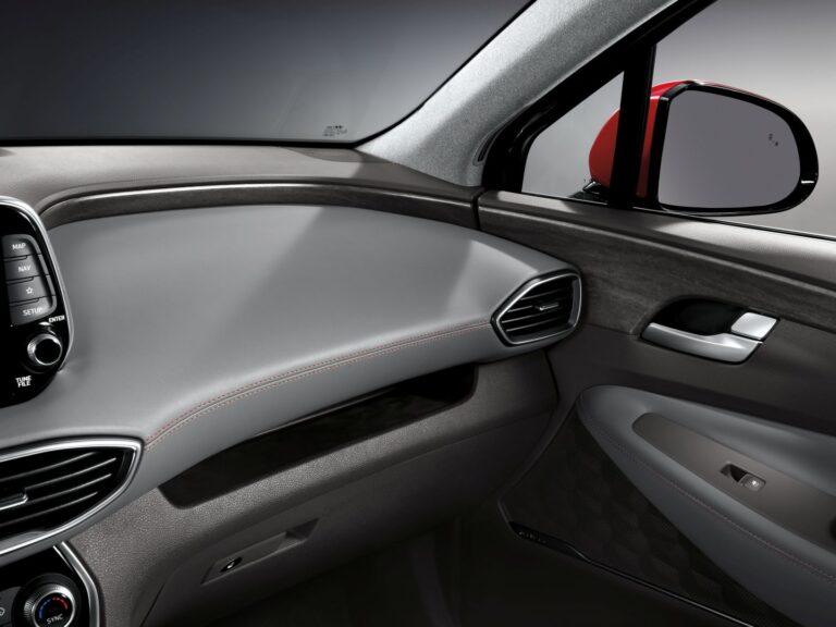 Wnętrze Santa Fe łączy premium jakość z przestronnym układem, oferując mocny poziomy motyw projektowy i zwiększoną widoczność. Luksusowe akcenty, takie jak warstwowe, trójwymiarowe panele instrumentów oraz kontrastowe przeszycia siedzeń, zapewniają wysoki poziom luksusu wewnątrz kabiny. Większy DLO w Santa Fe zwiększa uczucie przestronności wnętrza, wpuszczając dużą ilość naturalnego światła.
