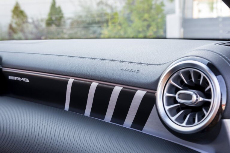 Pakiet aerodynamiczny AMG dla zoptymalizowanej równowagi aerodynamicznej, w tym zmodyfikowany splitter przedni i dodatkowe flics w przednim zderzaku, dodatkowy element dyfuzora, boczne wargi spoilerów na tylnej osłonie oraz tylni spoiler (A45) lub większa warga spoilera (CLA45) w czarnym połysku. Te cechy zwiększają docisk, a tym samym stabilność prowadzenia w fizycznych granicach.