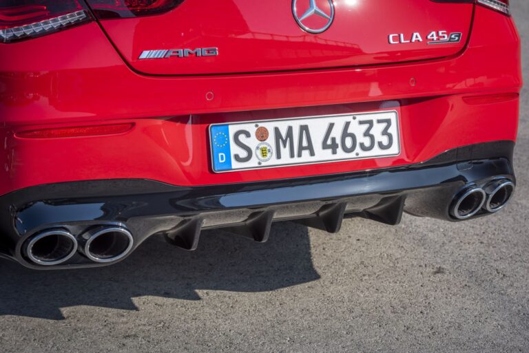 Tylny widok charakteryzuje się dwiema okrągłymi podwójnymi końcówkami wydechu (średnica 82 mm) oraz szerokim tylnym zderzakiem. Modele S są odróżniane przez większe, 90 mm końcówki wydechu z wewnętrznym żłobieniem i napisem AMG. Wrażenie szerokości z tyłu jest dodatkowo podkreślone przez smukłe dwuczęściowe lampy tylne. Dyfuzor z dwoma pionowymi podwójnymi żebrami przyczynia się do lepszej wydajności aerodynamicznej (CLA45: cztery pojedyncze żebra) – w centralnej części pojazdu jest wydłużony, co zwiększa jego skuteczność. Efekt kończy się na końcówce spoileru w kolorze pojazdu na spojlerze dachowym lub pokrywie bagażnika (CLA45).