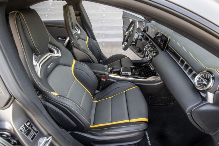 Imponująca obecność jest także podkreślona przez szersze przednie błotniki z wybrzuszonymi nadkolami. Tworzą one przestrzeń dla szerszej osi przedniej i podkreślają sportowy wygląd. Ten muskularny wygląd jest nawet silniejszy w modelu A45 4MATIC+ niż w CLA45 4MATIC+, ponieważ podstawowy CLA ma już szerszy rozstaw przedni, a błotniki można było poszerzyć w mniejszym stopniu.