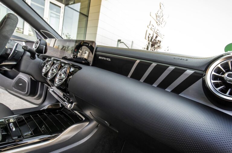 Przedni zderzak to także cecha wyróżniająca. W A45 4MATIC+ ma on formę projektowano w stylu skrzydeł odrzutowców. Poziome żebra w zewnętrznych wlotach powietrza i wydłużony dolny wlot powietrza podkreślają wrażenie szerokości. CLA45 4MATIC+ ma jeszcze bardziej ekspresyjny wygląd z jetowymi zewnętrznymi wlotami powietrza, które wskazują na bliski związek rodzinny z AMG GT 4-door Coupé. Przedni splitter płynnie przechodzi w boczne kurtyny powietrzne przed przednimi kołami, co optymalizuje przepływ powietrza, poprawiając osiągi aerodynamiczne oraz współczynnik oporu.